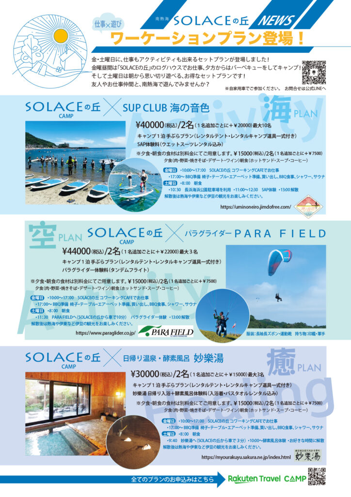 ▶ 楽天トラベルCAMPで「SOLACEの丘 ワーケーションプラン」を予約する